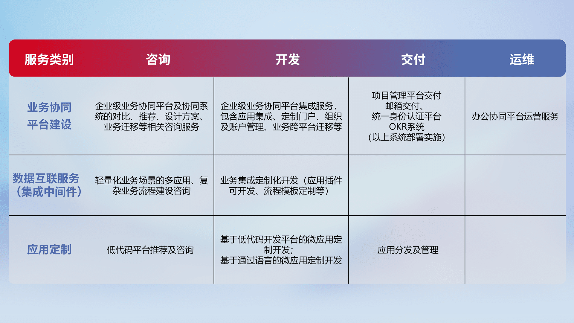 针对钉钉、、、、企微、、、、IDaas等平台级产品提供产品的规划、、、、方案、、、、交付、、定制化开发等服务,,,,实现如统一协同办公、、、智能客户服务、、混合会议管理、、、智能数据查询、、、、等业务场景,,,,实现数字化转型。。。